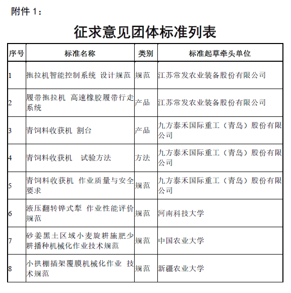 关于征求《拖拉机智能控制系统 设计规范》(征求意见稿)等8项团体标准意见的通知